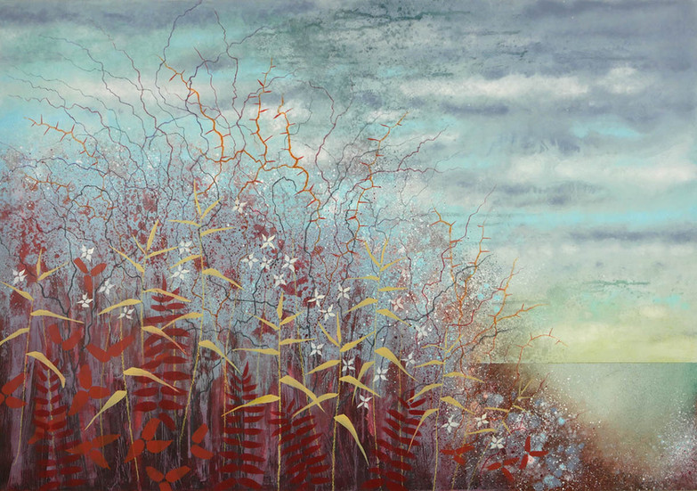 I didn’t begin with a fixed composition in mind, instead starting with broad areas of colour and more accidental marks, then following where they led, guided by a loose subject idea. For the first painting, I wanted a natural palette that referenced the coast. Once the horizon line was established, everything began to flow, and this mass of tangled seaside plants seemed to grow almost of its own accord. The teasels connect back to drawings I made over the winter, working from photographs taken in our garden and allotment. These slides (above) show the different stages of making At the Water's Edge: